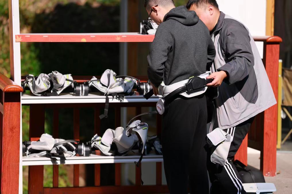 11月15日,江蘇南京棲霞山風景區,登山助力外骨骼租賃處前圍滿了前來體驗的游客。(受訪者供圖)